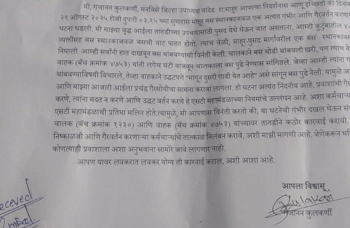 श्री. कुलकर्णी यांनी आपल्या तक्रारीत नमूद केले आहे की, चालक (बेंच क्रमांक १२३०) व वाहक यांचे हे वर्तन प्रवासी सेवेला विरोधी असून एसटी महामंडळाच्या प्रतिमेला धक्का पोहोचवणारे आहे. त्यांनी या दोन्ही कर्मचाऱ्यांवर कठोर कारवाई करून तात्काळ निलंबन करण्याची मागणी केली आहे.
